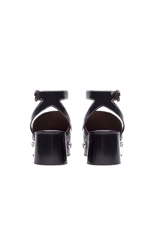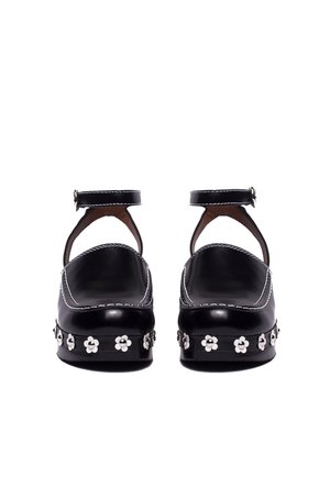 back by popular demand! this hand-lacquered black wood platform clog has a 2" heel with a 3/4" platform. the upper is executed in boxcalf leather with heavy contrast stitching. floral-cut leather accents are secured by dome studs at the profile. fits true to size. made by hand in Portugal.