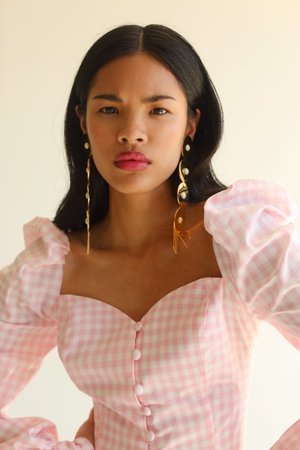 Sweetheart neckline with puff sleeve cap and fitted waist. Crisp fabric cool to the touch. - Cotton light pink gingham - Fabric buttons - Peplum - Smocked back detail allow for stretch - Recommended: Hand wash delicate and line dry - Model IS 5'6, 31",23",33" wears US2/UK4 XS