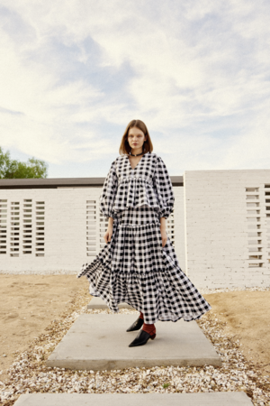V neckline top with puff sleeves and a ruffle peplum. - Screenprinted cotton gingham Model is 5'10, 176 cm, 33",25",33" wearing size US4/UK8 S with matching Camille Skirt Care: Dry clean suggested.
