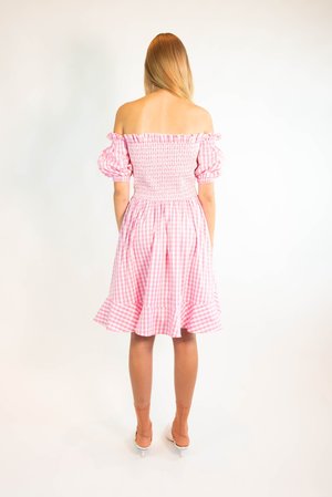 Off shoulder ruffle dress. Smocked waist and back detail with thigh length skirt. Pink gingham - 100% cotton - SS19 arriving January 15 2019 Model is 5'10, 176 cm, 33",25",33" wearing size US4/UK8 S Care: Dry clean suggested.