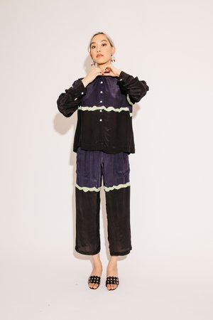 Cropped pant with elastic waist in a silky colorblock viscose with an embroidered squiggle detail. - Front patch pockets. - Back patch pocket. - Half lining. 100% Viscose. Made in India. An is 5' 7" and wears size S.