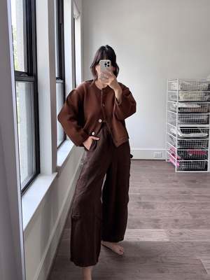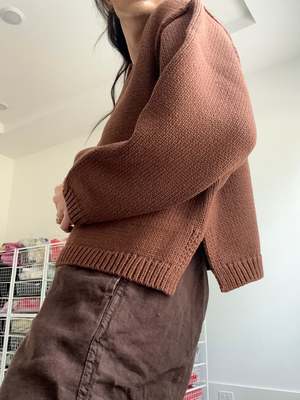 The Shiloh Cotton Cardigan by Nikki Chasin maintains the structure and chunkiness you love, but in a fabric suitable for warmer-weather seasons. This chunky sweater is crafted from 100% cotton in a mocha color and is true to size. Measurements across the front: - Small: Bust 22", waist 21", hip 22", length 21.5" - Medium: Bust 23", waist 23.5", hip 23", length 23" - Large: Bust 24", waist 24", hip 24", length 23.5" - Model is 5'5" wearing Size M - SKU #NCG5453. Please note, measurements are provided as a guide and may vary slightly due to the handmade nature of the garments.