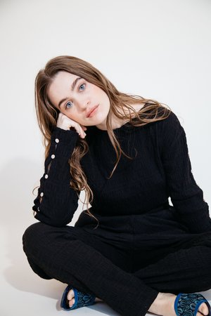 Crewneck long sleeve top with rows of shell buttons down sleeves. 98% Cotton 2% Spandex. Made in India. Paulena 5'4" and wears size S.