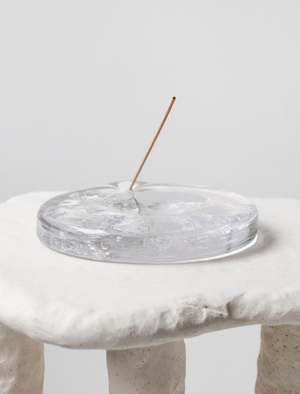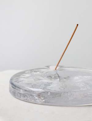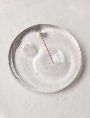 Part of a small series blown in the historic Holmegaard Vrk glass factory of Denmark, this incense tray is a stunning jewel ready to adorn your table. This small pool-like mound of glass is mouth blown and shaped with wooden tools to give it a unique rippled appearance. Perfect for both cone and stick incense, its clear composition catches light and glistens in the sun. - Made in Denmark - 6 x 1 - Hand wash with sponge or wipe with damp cloth