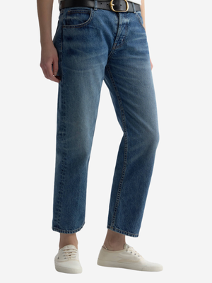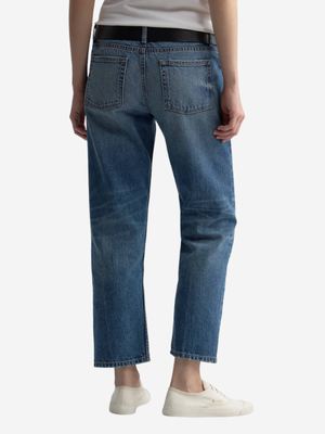 Nili Lotan's Lorimer is a low-rise, relaxed-tapered jean in Japanese non-stretch mid-weight textured denim. Relaxed through the waist and hips with a tapered leg and cropped ankle length. Classic five-pocket details, zip fly, branded shank closure, rivets at front pockets, and belt loops at front and back. Expertly crafted in the USA from premium Japanese non-stretch mid-weight textured denim. The fabric naturally softens with wear and may feature subtle variations in wash and texture from artisanal hand-washing techniques. Product Details Designer ID: 13555 W1451 Color: Rosebowl Wash Composition: 100% Cotton Made in USA Type: Denim