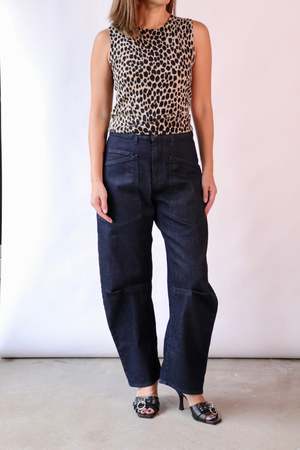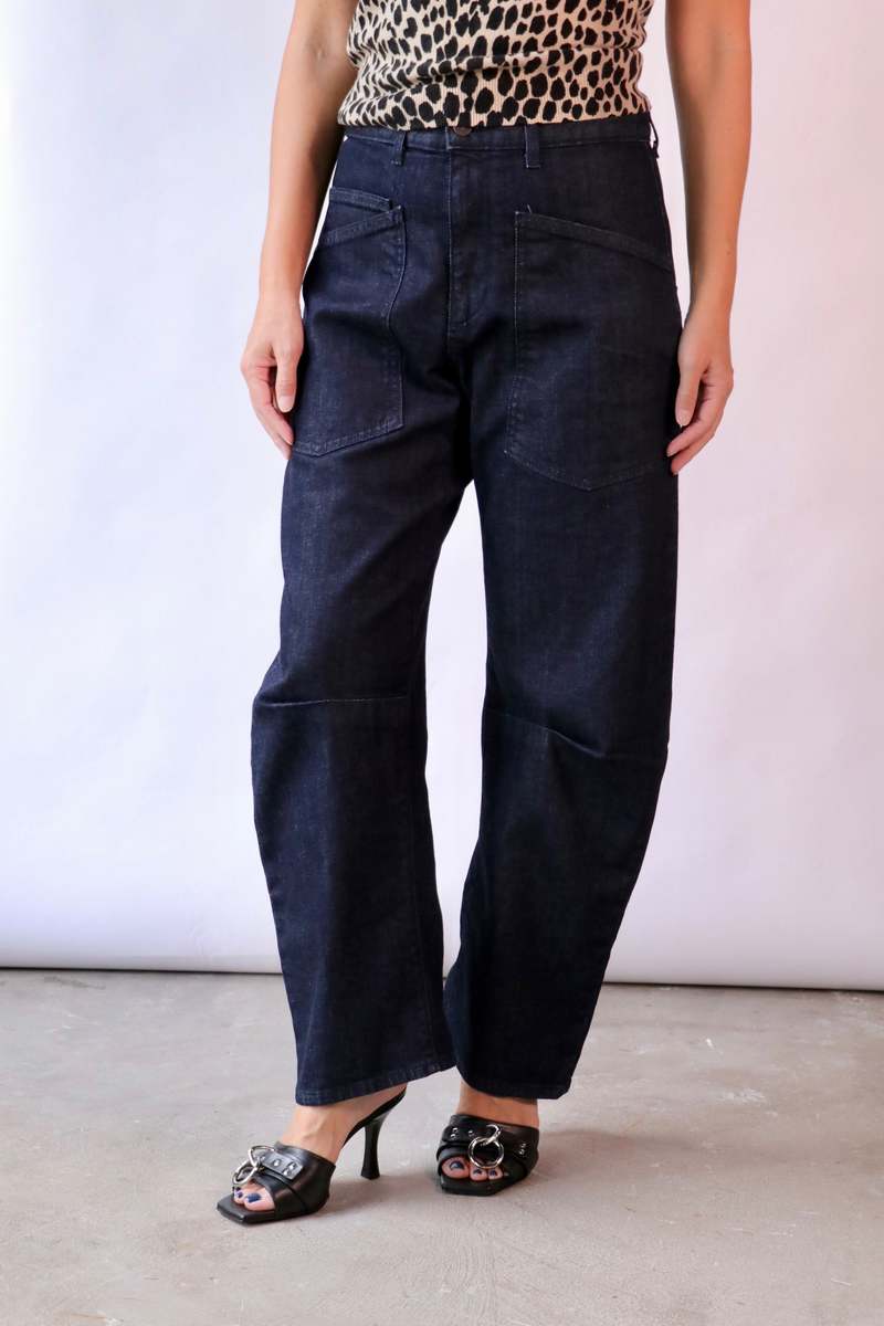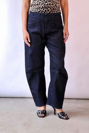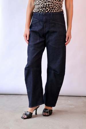 This mid-rise jean features a relaxed barrel leg crafted from Japanese stretch denim. It offers a distinctive curved shape with detailed seams at the knees and a gusseted inseam for enhanced comfort. Finished with a zip fly, shank closure, top-stitched patch pockets on front and back, and belt loops for added versatility. Designed for a 26" inseam. Made in USA.