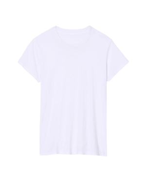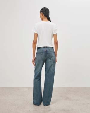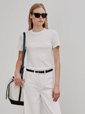 Slim crewneck tee. Higher collar. Smaller neck opening. Vintage pitched sleeve. Model is 5'11 with 31" bust, 25.2" waist, and 35" low waist. Model wears size S. Care guide 100% COTTON, MADE IN USA Dry clean