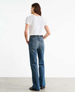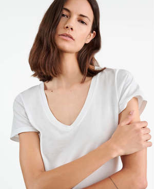 Relaxed fit v-neck short sleeve tee shirt in premium American cotton. Vintage pitch short sleeve. Self-binding along neck and sleeve. Care guide: 100% Supima Cotton Machine wash cold Tumble dry low Low iron Do not bleach Made in USA.