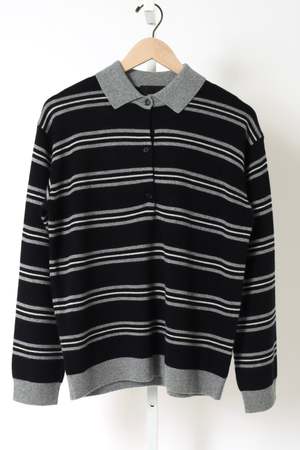 The Galvez Stripe Polo Sweater by Nili Lotan features a dark navy and grey stripe colorway.