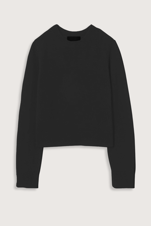Light to medium weight gauge. Crewneck. Long sleeves. Fully fashioned along neck, sleeve, and armhole. Center back signature cableknit detail. Shorter body, not cropped. 100% cashmere.