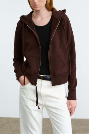 Slightly shrunken regular fit sweatshirt hoodie in American cotton with distressing details. Features patch pockets and a center front long draw cord at the zipper. Made in USA.