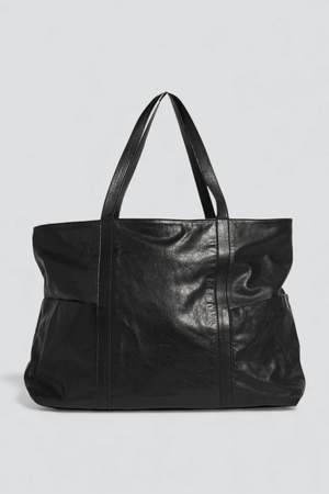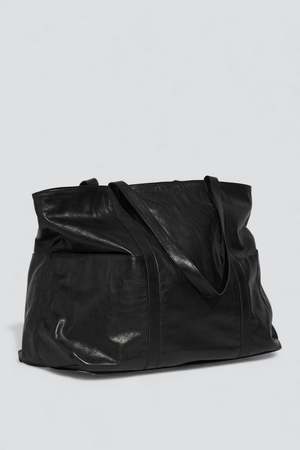 Black Beach Bag from Nimes. Crafted from small grain, vegetable tanned natural leather. Four external pockets and one internal zip pocket with cotton lining. - 100% Leather - Length: 22" / Depth: 15" / Height: " / Depth: 11"