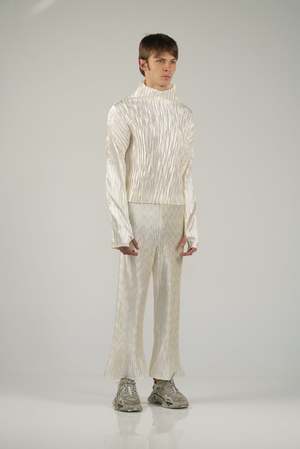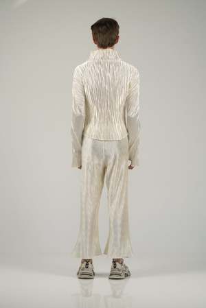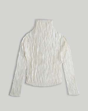 Long sleeved turtleneck top from Nin Studio in a glowing pearl satin fabric. High neckline can be turned up or down, depending on preference. Pleated in a diamond style, the Erosion Turtleneck makes a great pair with the Simple Pleat Pants. DETAILS + FIT - 100% deadstock polyester - Fabrics are pleated within a 1km radius of Nin's Mexico City studio - Hip length - Extra long sleeves with thumb holes - Unisex - Fits true to size - Handmade in Mexico City