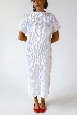The Orb Dress by Nin Studio is a mid-sleeve, wave pleat midi dress featuring a side slit opening, unique prints, and an open neckline. Unisex and versatile, this pleat midi dress is a must-have. The Orb Dress runs true to size and is made from 100% polyester dead-stock sourced locally in Mexico City. Nin Studio pieces are ethically made in Mexico City. All items are pleated locally within a 1 km radius of their studio, working with a family-owned Mexican business to heat press the design onto the fabric. Masha is wearing a size small. Sizing: XSmall (US 2): Bust 32"-33", Waist 24"-25", Hip 34"-35" Small (US 4): Bust 33"-34", Waist 26"-27", Hip 36"-37" Medium (US 6): Bust 34"-35", Waist 28"-29", Hip 38"-39" Large (US 8): Bust 35"-36", Waist 30"-31", Hip 40"-41" XLarge (US 10): Bust 36"-37", Waist 32"-33", Hip 42"-43"