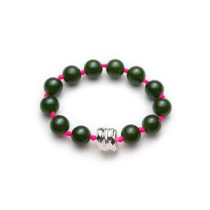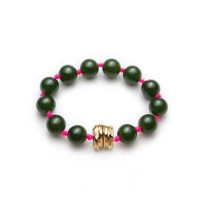 DIVE INTO THE DEEP SEA Dive into the depths of the Jade version of the iconic SOGA bracelet. Each jade bead is separated by an exaggerated nautical-inspired knot crafted from a brightly coloured cord and bound together by a decorative magnetic clasp that keeps the bracelet securely fastened. In celebration of rugged seascapes, the jade is intentionally deep and translucent to reflect the nuanced colours of ocean depths, algae, and calm winter tides, while the textured groves of the ornamental clasp pay tribute to eroded sea cliffs sculpted by salt winds and crashing waves. The Jade SOGA bracelet is locally handcrafted by Nina in her Montreal atelier. The must : The versatility of the magnetic clasps featured on the SOGA bracelets and necklaces makes them easy to mix and match. Extend your necklace with a second SOGA bracelet, create contrasting tones or play with thread colours. In other words, be the artist of your jewellry. _________________________________________________________________ Material & Measurements - Dark green jade beads (12 mm) stringed on neon pink nylon thread. - Magnetic clasp is available in 14k gold plated brass (3 microns thick) or in sterling silver. - Polished finish - Available in 3 different lengths : S : 16,5 cm (6,5 po) / M : 18 cm (7 po) / L : 19,5 cm (7,5 po). Unsure of your size? Ask for assistance : hello@ninajanvier.com __________________________________________________________________ Details - Sold per unit - Available on demand with 14k or 18k solid gold clasp. - Important notice : Magnets are not suitable for people with a pacemaker or other electronic medical device as well as for pregnant women (ask your doctor for advice). - How to care of your jewelry : see __________________________________________________________________ Shipping * Each piece purchased during the preorder period will be shipped by the 5th of december 2022. Past this, the delivery is not guaranted before christmas. For more details : shipping. * For questions or further details, please email hello@ninajanvier.com. "DMARQUEZ-VOUS AVEC STYLE "