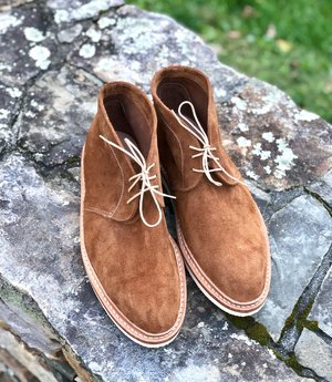 Three-eyelet chukka in suede Leather lined with cushioned insoles Goodyear storm welt Lightweight rubber sole in white Handmade in USA Also available in Forest Green, Navy & Chocolate LENOX | Style # CH7SDE | Last # NW102 Pick up a horn-trimmed suede brush to keep your new boots looking great.