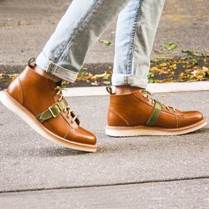 Monkey boot with buckle in vegetable-tanned leather Leather lined Olive green tongue and trim Goodyear storm welt White extra-light sole Handmade in USA Available in English Tan, Midnight VAN DAM | Style # MB1VCT | Last # NW101 Keep your new boots looking great with our cedar shoe trees and Saphir shoe polish.