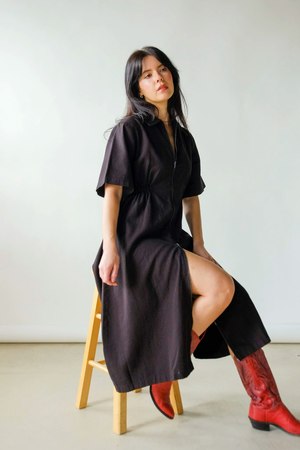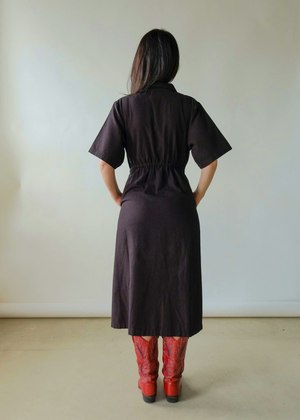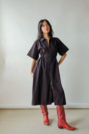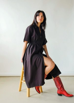 The Long Utility Dress by Noble features a two-way zipper, oversized sleeves, a cinched elastic waist, and a full skirt for a flattering, comfortable fit. Made from durable yet buttery-soft 8oz Pima cotton canvas, GOTS-certified organic and fully traceable from plant to product. Garment-dyed with eco-friendly processes; each piece is pre-washed and pre-shrunk for an ultra-soft feel and impeccable fit. We recommend sizing down. Fabric: 100% cotton.