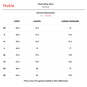 The Shell Utility Shirt has a boxy, cropped silhouette that is easy and comfortable. It features two chest pockets and three mother-of-pearl buttons. Hitting at the high waist, this cropped top pairs perfectly with the Shell Utility Skort. Crafted from 100% GOTS-certified organic pima cotton, it is durable and soft. Details Gabby is 5'5" and wearing a size Small. Bust: 32" / Waist: 26" / Hips: 33.5" - Fit is generous. If on the fence or between sizes, size down. - 100% GOTS-certified Organic Cotton Canvas - Pre-washed and pre-shrunk for a super soft feel - Hand wash + hang dry - Made in Peru