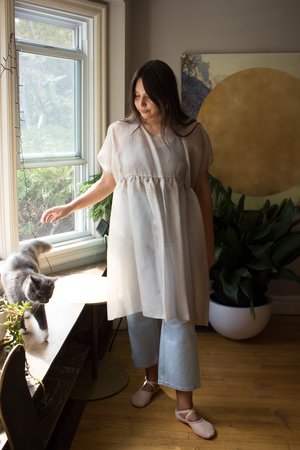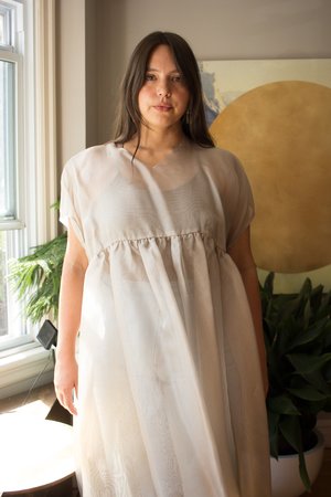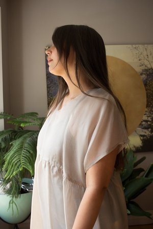 The Tulip dress from Noemiah is a fantasy come to life. Featuring a voluminous gathered skirt with v-neck and short sleeves, the Tulip dress showcases the designer's expertise at combining elegant simplicity with an awe-inspiring maximalist flare. Made from a luxurious silk organza, this dress is incredibly lightweight, breathable and will only get more comfortable with every wear. The semi-sheer gloss of the fabric makes the Tulip dress extraordinarily fun to play around with layers. Pair it with your favourite jeans and top to add a little drama, or pair over your best lingerie for a daring, sexy look. There's so many possibilities to explore with this dress and we encourage every one! Sizing Notes: This style is one-size, fitting up to size 18. The length is 38". 100% Silk Organza Fabric does not stretch Dry Clean Only Also available in Black and Fuchsia Made in Montreal When you shop with Victoire, you're supporting independent Canadian designers. Noemiah is a Montreal designer who creates feminine, modern clothing with unique touches of embroidery and print. We love her whimsical designs!