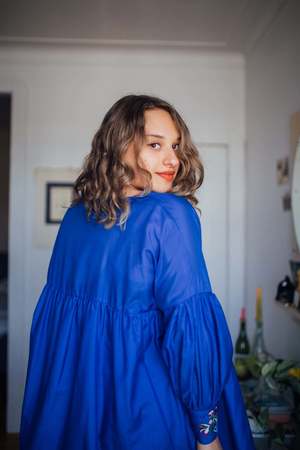 Noemiah's Celia Dress is maximum volume on maximum volume: full sleeve drama and full body flare! The gathered bust and sleeve seams line up beautifully across the front, adding elegant details to this otherwise minimalist piece. The lantern sleeve creates a large pouf at the elbow and are embroidered at the cuff. This dress is just a touch sheer, so it would look great layered with a slip dress or full-on outfit underneath. This dress will bring the fun whether your plans are to go dancing with your besties or loitering in the grocery store magazine aisle! Size Notes: This style is One Size and well suited up to Size 22. Thanks to feedback the designer received, the bust line now sits lower, making it more flattering for larger busts. Fabric does not stretch Wash cold and hang to dry, or dry clean Made in Montreal