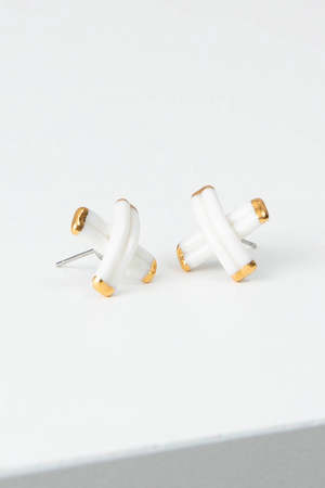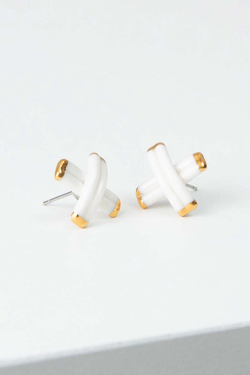 The Porcelain Criss-Cross Studs by Noonday are modern earrings crafted from smooth white porcelain with gold-tone accents. Their sculptural criss-cross design offers a subtle yet distinctive detail. These studs are lightweight for comfortable wear throughout the day. Each pair is handcrafted by artisan partners, reflecting a commitment to thoughtful design and craftsmanship. The clean lines and balanced proportions make them suitable for both professional and casual settings. Handcrafted from smooth white porcelain and finished with gold-tone accents. Lightweight design for comfortable all-day wear. Features a unique criss-cross shape for a modern aesthetic. Measures approximately 0.75 inches in length and 0.5 inches in width.