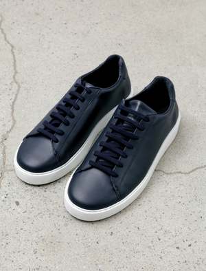 A classic tennis-style sneaker in navy blue leather. Features flat cotton laces in navy and a contrasting white rubber sole. Subtle logo2 stamp on the tongue. - Made in Portugal - 100% leather