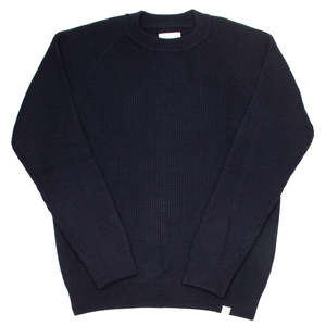 Why we picked & love this product: Norse Projects latest sweater style made from a wool cotton blend and coming in a relaxed fit Product category: sweater Product description & details: raglan sleeves, 7 gauge 3 ply, ribbed neck trim, cuffs and hem Material type: wool cotton blend - soft Composition: 79% wool 21% cotton Color: navy Fit: relaxed Sizing: true to size Measurements: feel free to contact us for measurements and/or more details about this product Made in: Tunisia Brand: Norse Projects (Copenhagen, DK - est. 2004) Product name: Roald Cotton Wool Style reference number: N45-0545 Collection: FW23 Care instructions: handwash or gentle dry clean, no bleach, no tumble dry