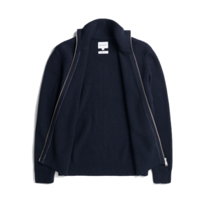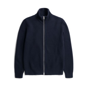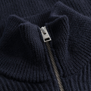 A Norse Projects regular fitting sweater made from Scottish lambswool. It is constructed in Scotland using a seamless tubular knitting technique, which creates a more comfortable garment and improved range of motion. A full zip jacket knitted from a mix of fine cotton and wool. The wool yarn is treated without the use of chlorine while remaining washable. It has an authentic look yet comfortable hand-feel. Wool keeps the body temperature stable and enhances breathability which creates more comfort. By adding the cotton yarn, a chunkier half cardigan structure and a slightly softer hand feel are achieved. The style is constructed with set-in sleeves, zipper at center front and finished with a ribbed neck trim, cuffs and hem, and branded tab at the hem. 79% wool, 21% cotton 7 gauge, 3 ply Regular fit Knitted in Italy Branded tab Assembled in Tunisia