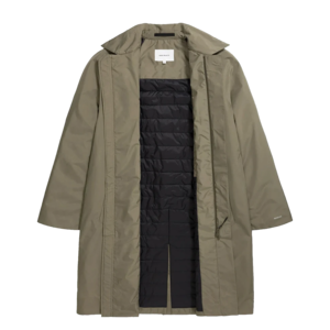An insulated mac coat constructed using WINDSTOPPER by GORE-TEX LABS and Primaloft insulation. Features classic mac detailing, a slightly oversized fit, and raglan sleeves. Finished with reflective details for visibility in city conditions. The totally windproof yet extremely breathable membrane blocks wind and allows vapor to escape, minimizing chilling effects while reducing overheating during activity. A durable recycled outer fabric with DWR treatment provides additional water repellency. Insulated with Thermore Evodown recycled padding. Made in China.