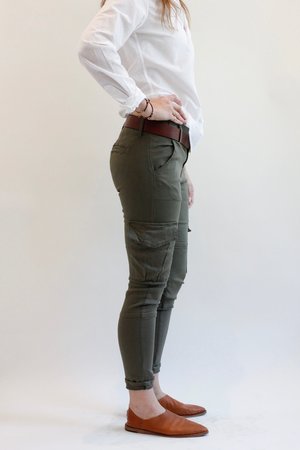 Cotton, modal, and polyester stretch cargo pant.