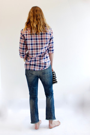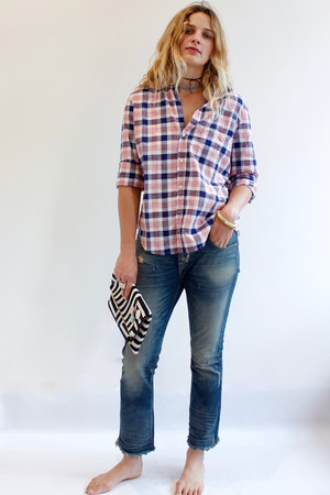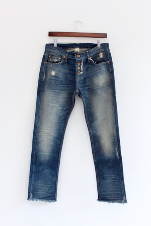 A distressed straight leg, sleightly slouchy, jean that is cropped with a frayed hem. Made in the USA.