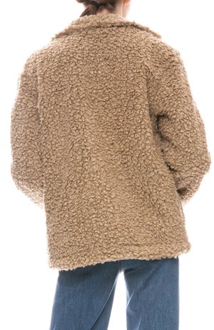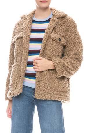 NSF Reese utility jacket with front button closure and front flap pockets. Japanese faux shearling with a super soft plush hand feel. Model is 5' 9" wearing size S. Made with 100% Polyester.