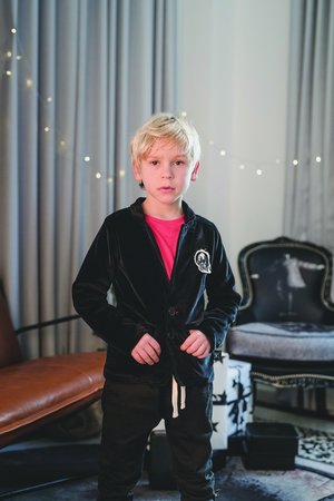 its hard to find a better winter look than this sharp nununu velvet jacket for boys & girls. it has the look of the mid-20th century smoking jackets, except this version is super soft and slouchy. it can go with dress pants or jeans, or even over a dress or skirt or a cute menswear mix-it-up moment. we just had to add a skull patch to the chest to shake things up a bit. 80% cotton 20% polyester hand wash cold, do not tumble dry final sale