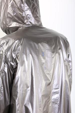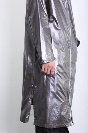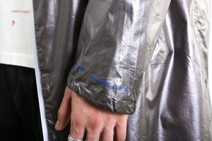 The Metal Bonze Long Coat from Oakley by Samuel Ross for Fall 2018 Details Hooded long jacket. Waterproof zipper with Side snap opening. Zippered pocket. Clear PVC lower rear insert. Drawcord cuff. Electric Blue Logo print and Samuel Ross signature. 100% Polyamide Sizing True to size