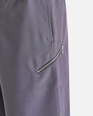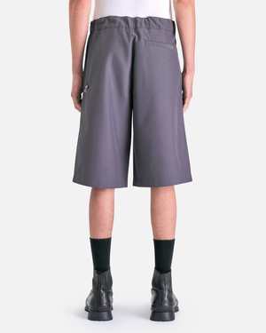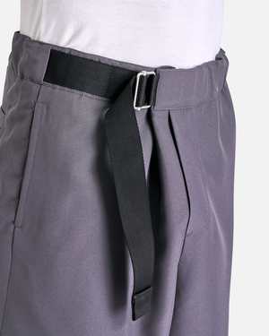 OAMC Regs Short in Dark Grey. These shorts feature a semi-elasticated waist with an integrated webbings belt, two side pockets, side zip pocket on the thigh and a single welt pocket at the back.