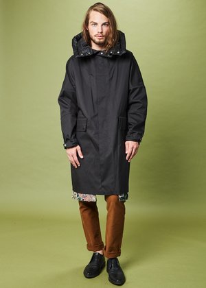 OAMC's Bohica Parka features a detachable down feather hood and accent panels at the hem. Details - Hidden zip and snap closure with snap collar. Silver hardware. Metal shank button cuffs. - Foldover pockets. Vented back. Adjustable belt in back. Center back seam. - Adjustable buckles on exterior hood. Canvas floral panels at hem. - Shoulder 18", 24.5" chest, 28" length (approximately). - Gentle dry clean. - Made in Italy. Color black. 61% polyester, 39% polyurethane. Inner hood, 100% polyamide. Parka runs true to size with an oversize cut. Model is wearing a small, Ian is 6'1", 38" suit, 31 waist, 32 inseam.