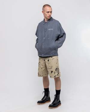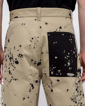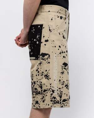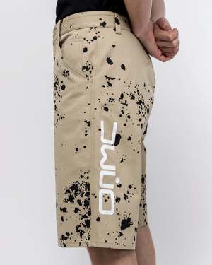Regular fit shorts in 'dark beige' brown. - Mid rise. - Five pocket styling. - Button and zip closure at front. - Logo print at back side seam. - Splatter print in black throughout. - 100% cotton. - Tonal stitching. - Made in Italy. Aaron is 6'0 (182cm) weighs 145lbs (65.7kg) and is wearing a size 29.
