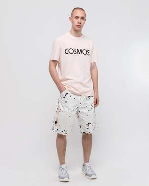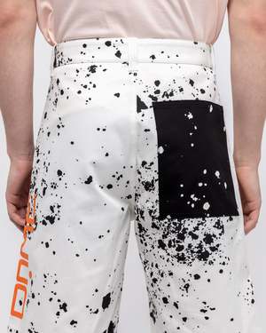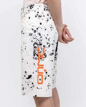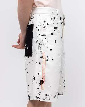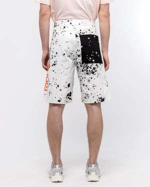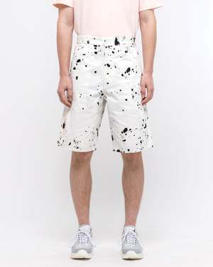 Regular fit shorts in 'natural' white. - Mid rise. - Five pocket styling. - Button and zip closure at front. - Logo print at back side seam. - Splatter print in black throughout. - 100% cotton. - Tonal stitching. - Made in Italy. Aaron is 6'0 (182cm) weighs 145lbs (65.7kg) and is wearing a size 29.