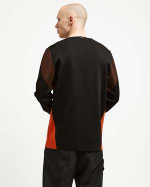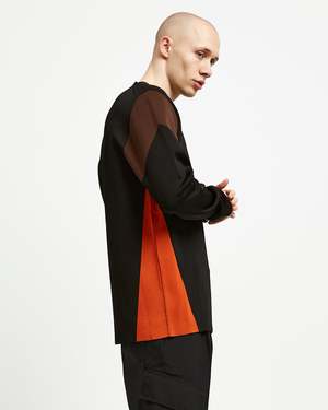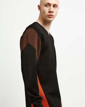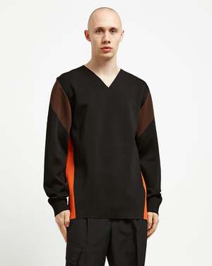 OAMC Primary V-Neck Sweater in Black A tightly woven double-faced viscose sweater with an elongated hemline. The sweater has a V-neck with contrasting panels along the side seam and shoulder armhole. - 90% Viscose, 7% Nylon, 3% Elastane - Made in Italy - Dry clean only - OAMU750267 Aaron is 6'0 (183cm) weighs 170lbs (77kg) and is wearing a size S.