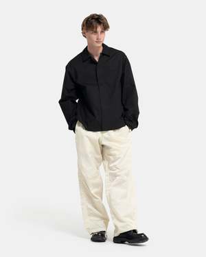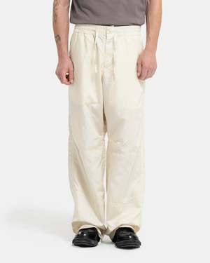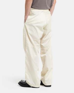 OAMC Turner Pant GD in Ivory The Turner Pant is a wide, straight-leg trouser set in a lux crinkly nylon twill. Find subtle articulated darting at the knees and panelled detailing beneath. Self-tie drawstrings are fitted at the ankle cuffs and elasticized waist for adjustable wear. The pair are complete with side pockets, a single rear patch pocket, and a zip-fly with press-stud. - 100% Nylon. - Made in Italy. - Hand wash cold, line dry - 24E28OAU45. Kobe is 6'0 (183cm) and is wearing a size M.