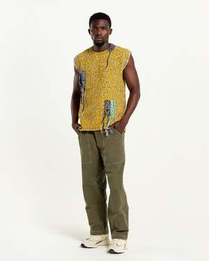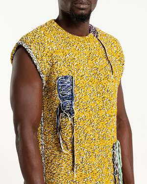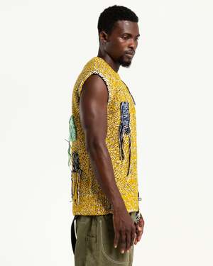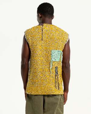 OAMC Astral Gilet in Marigold The Astral Gilet is a highly textured wool vest with a crew-cut neckline and a contrasting maroon strip for a quarter of the collar. The sweater has multiple contrasting knit patches with loose threads. - 50% Wool, 37% Cotton, 13% Polyamide. - Made in Italy. - Dry clean only. Basit is 5'9 (180 cm) weighs 165lbs (75 kg) and is wearing a size XS. Custom product true Age group adult Gender male