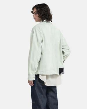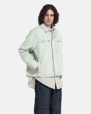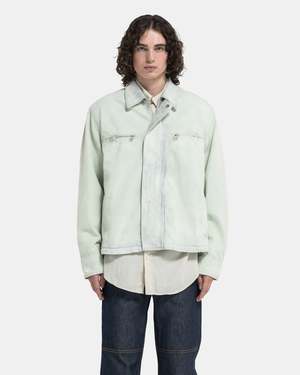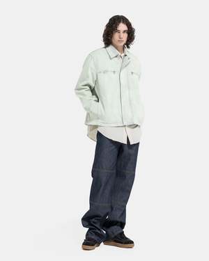 OAMC Titan Jacket in Pistachio The Titan Jacket GD has an oversized, drop-shoulder fit, and features a panelled construction. The jacket is made of a thick but supple denim finished with a heavily faded wash and bleach throughout. The jacket is equipped with side seam pockets, adjustable snap cuffs, chest zip pockets, and a zip closure concealed beneath a press-stud front placket. A leather brand patch sits at the rear hem to finish. - 100% Cotton. - Made in Italy. - Hand wash cold, hang dry. - 24E28OAU48T. Kobe is 6'0 (183cm) and is wearing a size M.