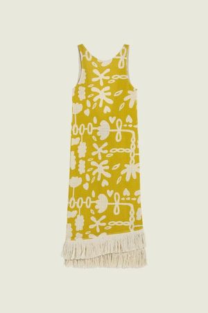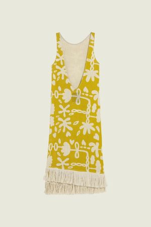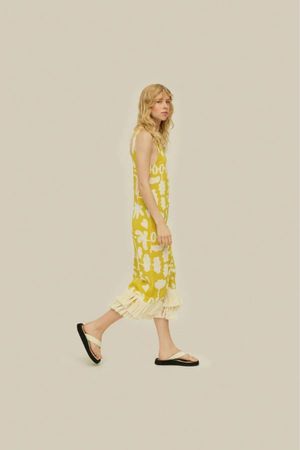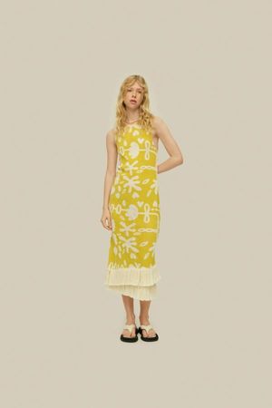 The Galbanum Ari Slip Net Dress features a cotton bobbinet weave patterned with an abstract take on botanical motifs, offering airy lightness to occasion dressing. A sleek midi-length silhouette designed with a deep open back and traced with sweeping fringing at the hem. DETAILS: - Midweight Woven Bobbinet - Breathable - Rounded Neck - Low Cut Back - Midi Length - 100% Cotton - Designed in Sweden, Made in Portugal - Care - Hand Wash Only SIZE + FIT: - Straight Fit - Fits True To Size - Model is 175 cm / 5'9" and wears size S.