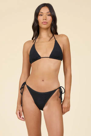 The Krinkle Side Tie Bottom features a side-tie style, adjustable fit, and crinkle texture. Materials 94% Nylon, 6% Spandex Care Hand-wash in cold water with a gentle detergent to prevent stretching and fading. Sizing One size fits most.
