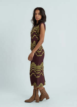 Odeeh's Geo Print Dress features a double geometric print, mid-calf length, cap sleeves and rear zipper. Details - Rear zip closure. - Cap sleeves. - Mid-calf length. - Rear vent. - Side pockets. - Dry clean only. - Imported. Color goldolive. 100% viscose.