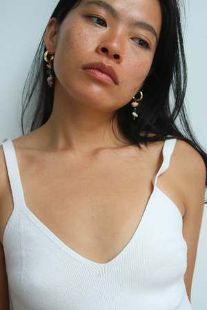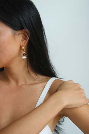 14k gold plated over 9.25 sterling silver hoops featuring red pearls, tiger's eye, and shells sourced from Australia and Miami.