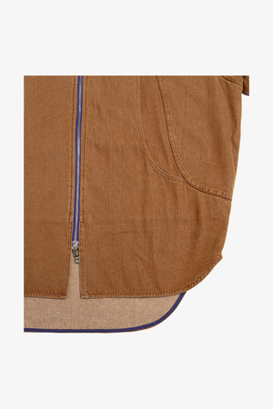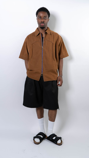 Short-sleeve jacket made from soft-washed cotton denim for a comfortable, broken-in feel. The washed brown fabric reveals subtle fading for a vintage effect. Features wave-cut panels and oversized chest pockets for added depth and structure. Two-way silver YKK zipper set on a purple zipper tape provides a contrasting front detail. Matching wave-cut paneling at the back shoulder. Relaxed fit suitable for layering over short or long sleeves. 100% Cotton Made in China Sizing - Relaxed/boxy fit. - Model is 5'11" / 154 lbs, wearing size M. Size chart (measurements in CM; manual measurement may result in a 12 cm margin of error): S: 1/2 Chest 67, Shoulder 54, Sleeve 29, Length 77 M: 1/2 Chest 71, Shoulder 57, Sleeve 31, Length 80