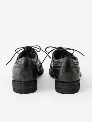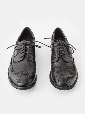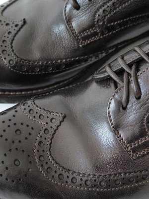 classic wingtip oxford in a dark chocolate burnished leather. features perforated design detailing, treaded sole, and elastic under tongue to allow for wearing without laces. please note that this style runs slightly large. handmade in italy. 100% leather body with combination leather and rubber treaded sole.