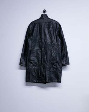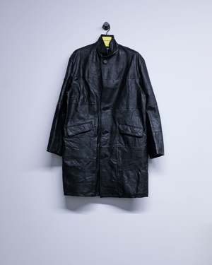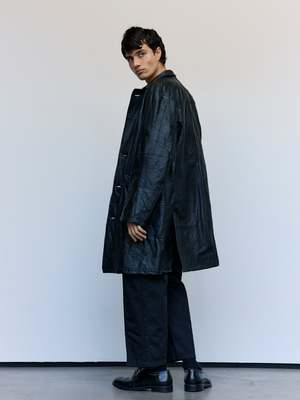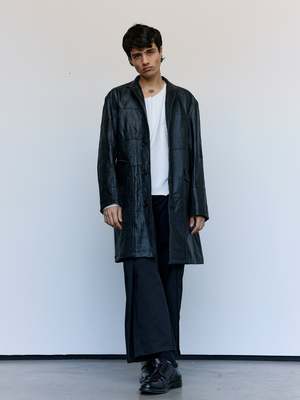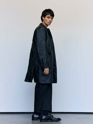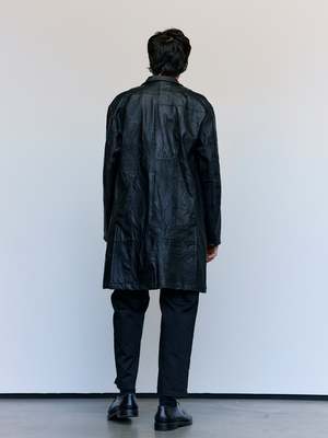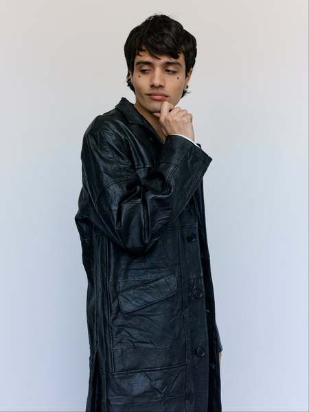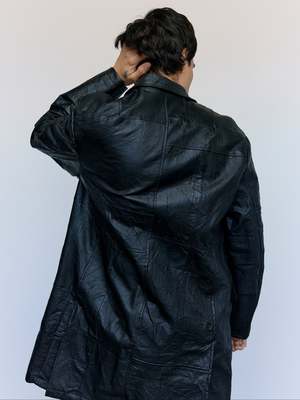 Crafted from reclaimed leather jackets, this leather Chesterfield jacket exemplifies sustainable luxury. The relaxed full-length silhouette offers effortless sophistication, while the distinctive stand collar and dual flap front pockets deliver both style and practicality. A versatile piece that bridges vintage character with contemporary design sensibilities. Leather Kin is 6' and wearing a Large.